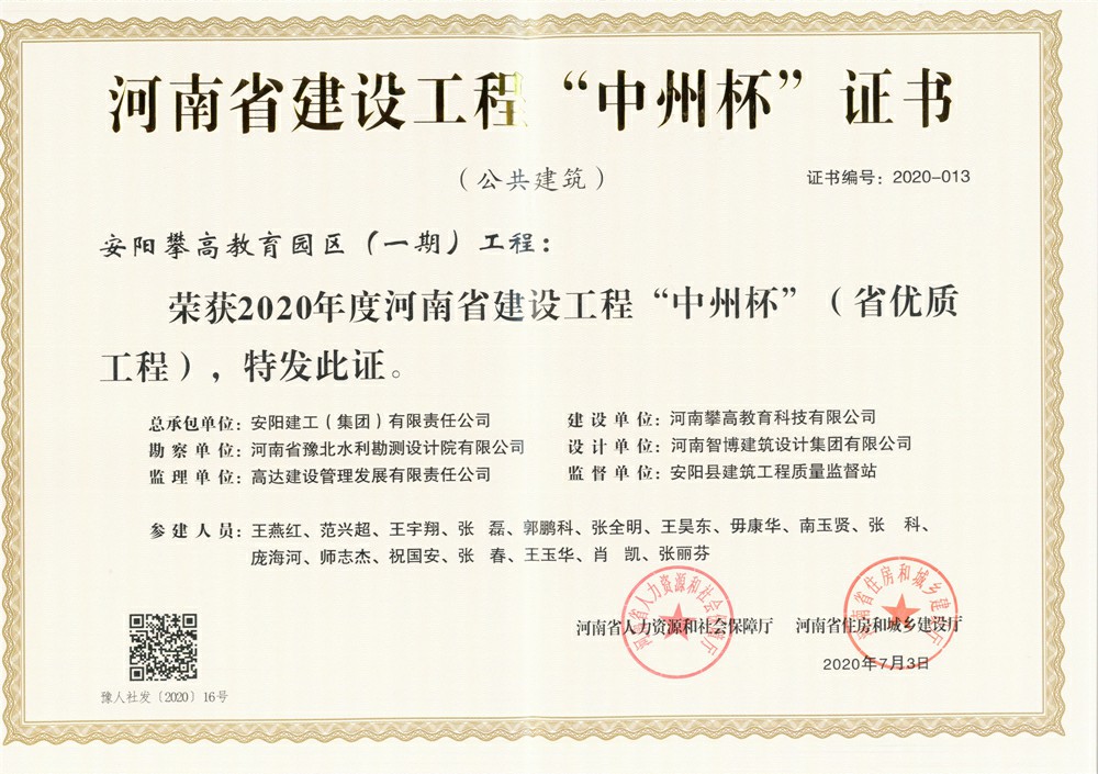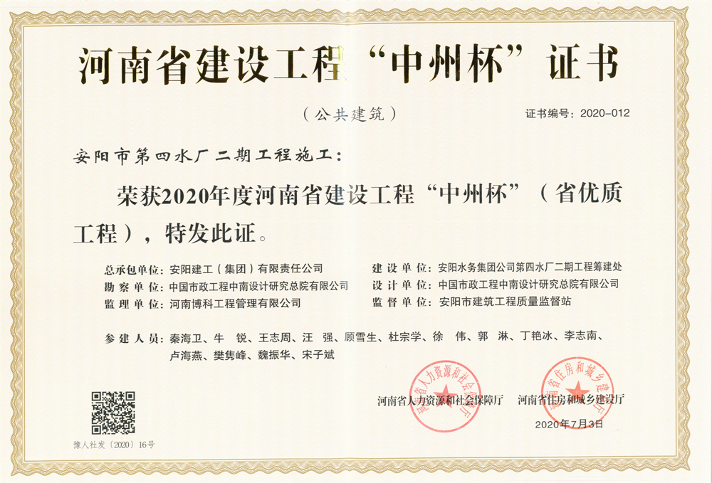 由我公司承建的“安陽市第六水廠”、“安陽市第四水廠二期”、“安陽攀高教育園區(一期)”工程被評為2020年度河南省建設工程“中州杯”獎。