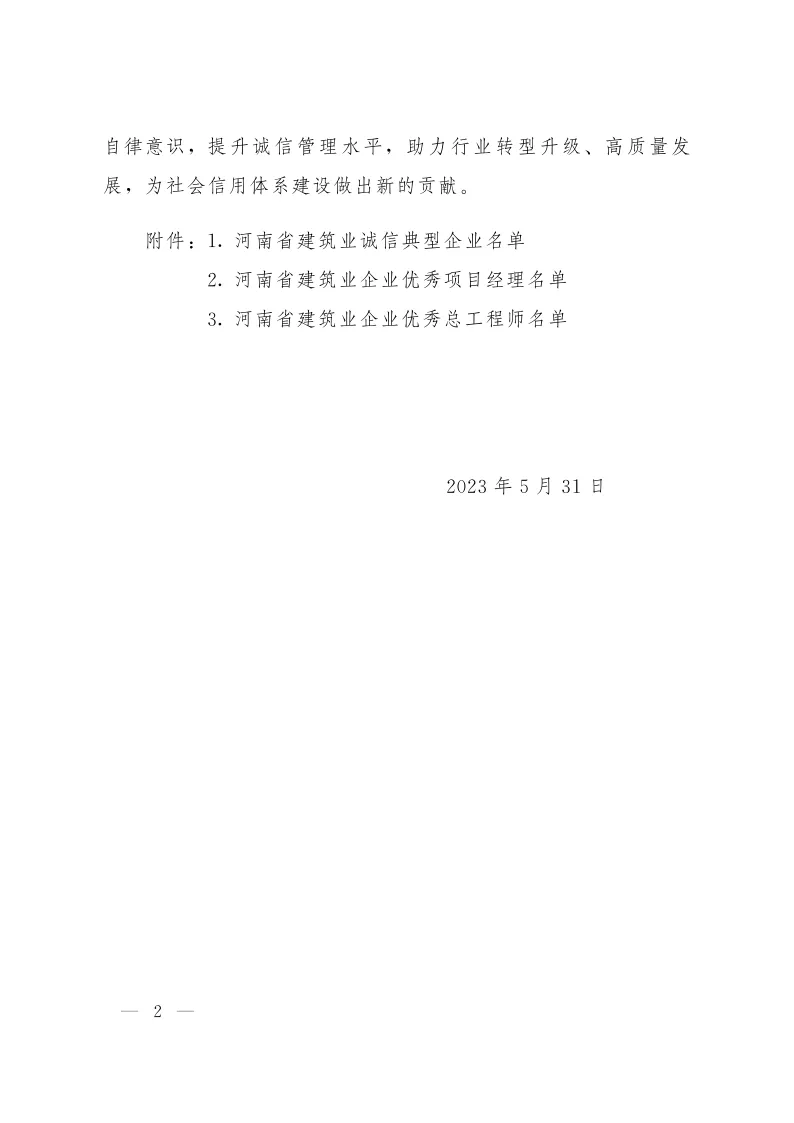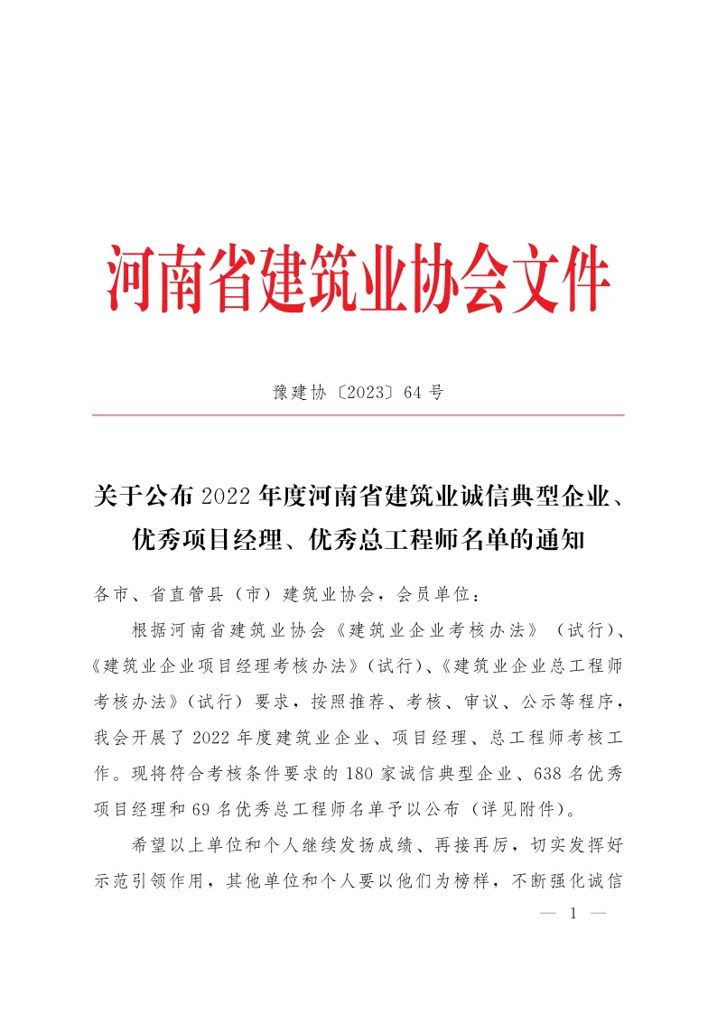 近日,河南省建筑業協會發布《關于公布2022年度河南省建筑業誠信典型企業、優秀項目經理、優秀總工程師名單的通知》(豫建協【202364號),對180家誠信典型企業、638名優秀項目經理和69名優秀總工程師名單予以公布,我集團公司榮獲“河南省建筑業誠信典型企業”,郭瑞峰等18名同志榮獲“河南省建筑業企業優秀項目經理”,王磊同志榮獲“河南省建筑業企業優秀總工程師”。