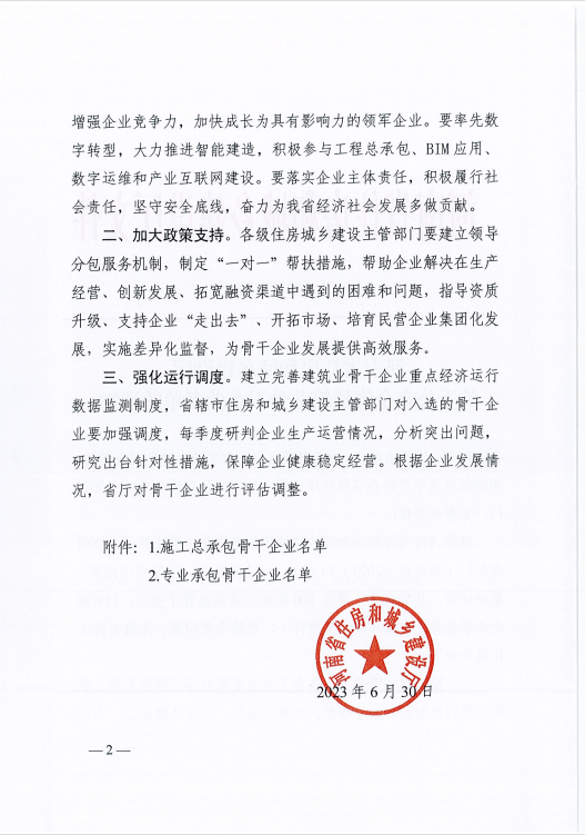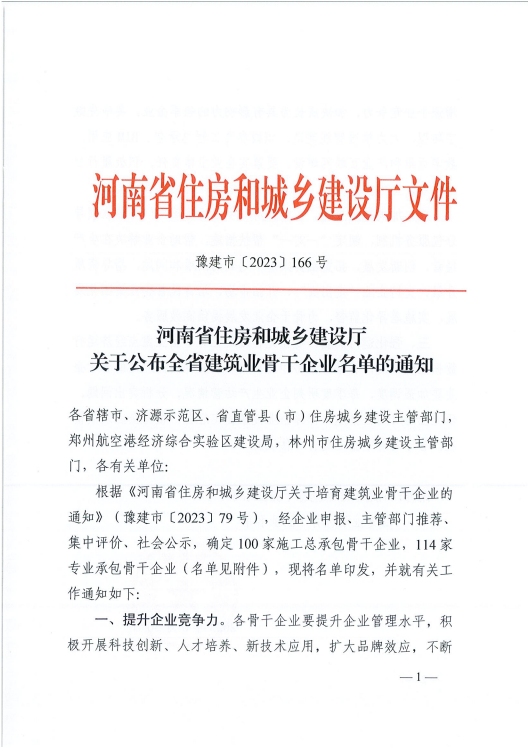 近日,河南省住房和城鄉建設廳發文,公布全省建筑業骨干企業名單,經審核認定,我集團公司榮獲“河南省建筑業施工總承包骨干企業”,成為2023年評選出的100家“施工總承包骨干企業”之一。