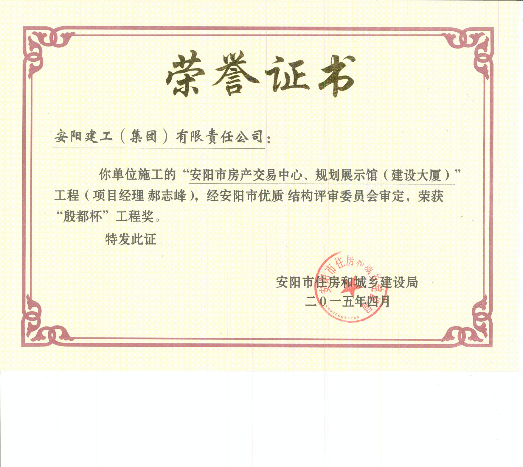 我單位承建的“安陽市房產交易中心、規劃展示館(建設大廈)”工程榮獲“殷都杯”工程獎