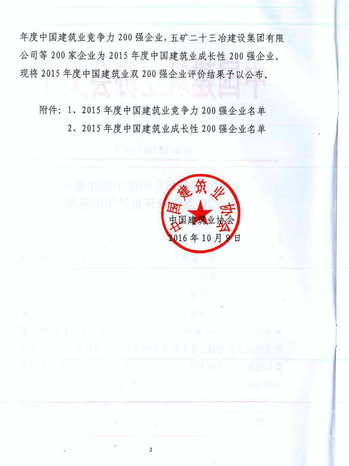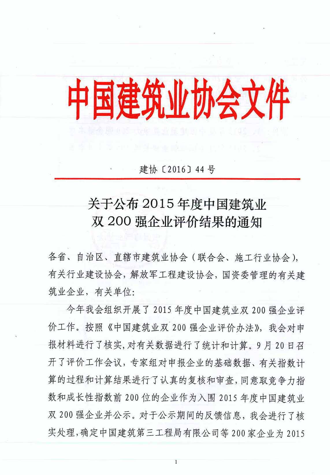 關于公布2015年度中國建筑業雙200強企業評價結果的通知