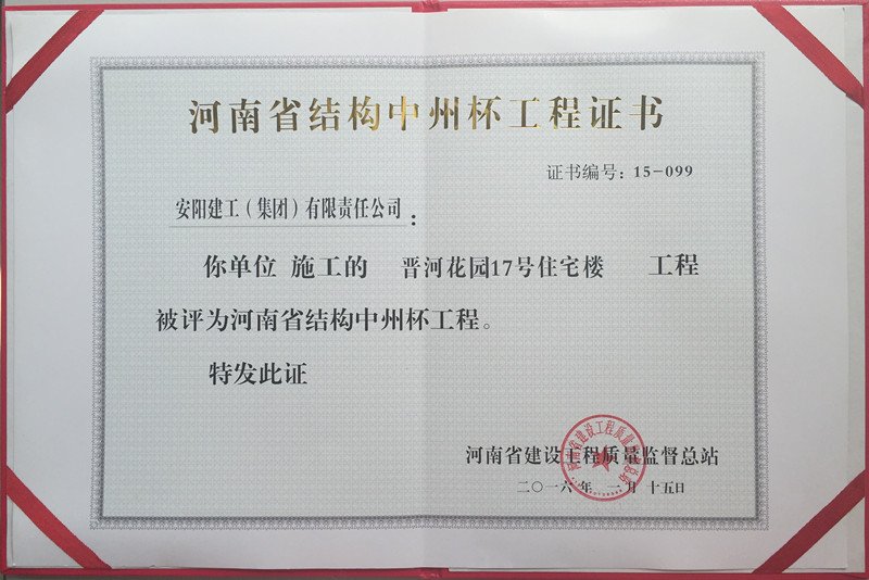 我單位承建的 晉河花園17號住宅樓 工程被評為河南省結構中州杯工程