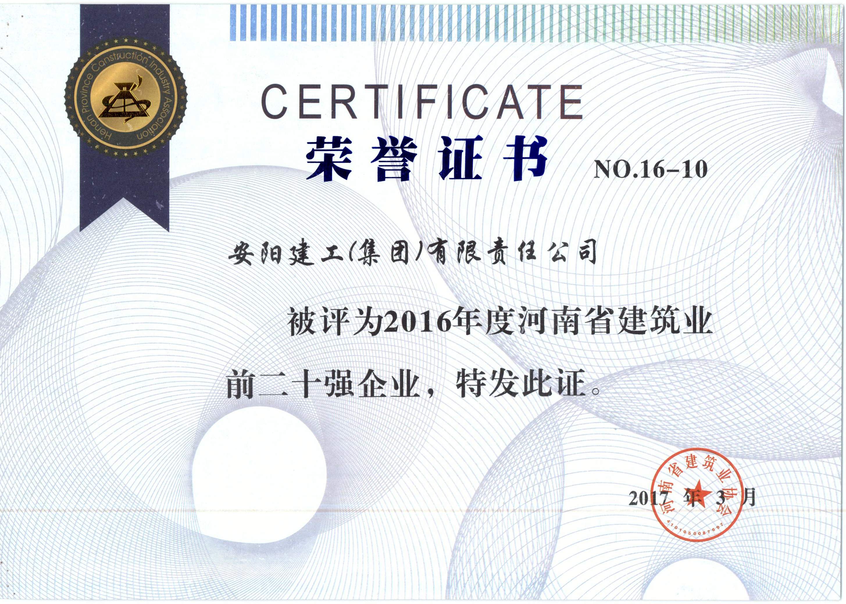 我公司被評(píng)為2016年河南省建筑業(yè)前二十強(qiáng)企業(yè)
