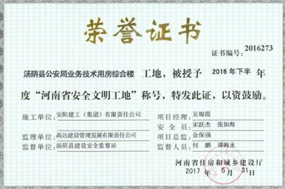 我公司承建的湯陰縣公安局業務技術用房綜合樓工地榮獲2016年下半年“河南省安全文明工地”稱號