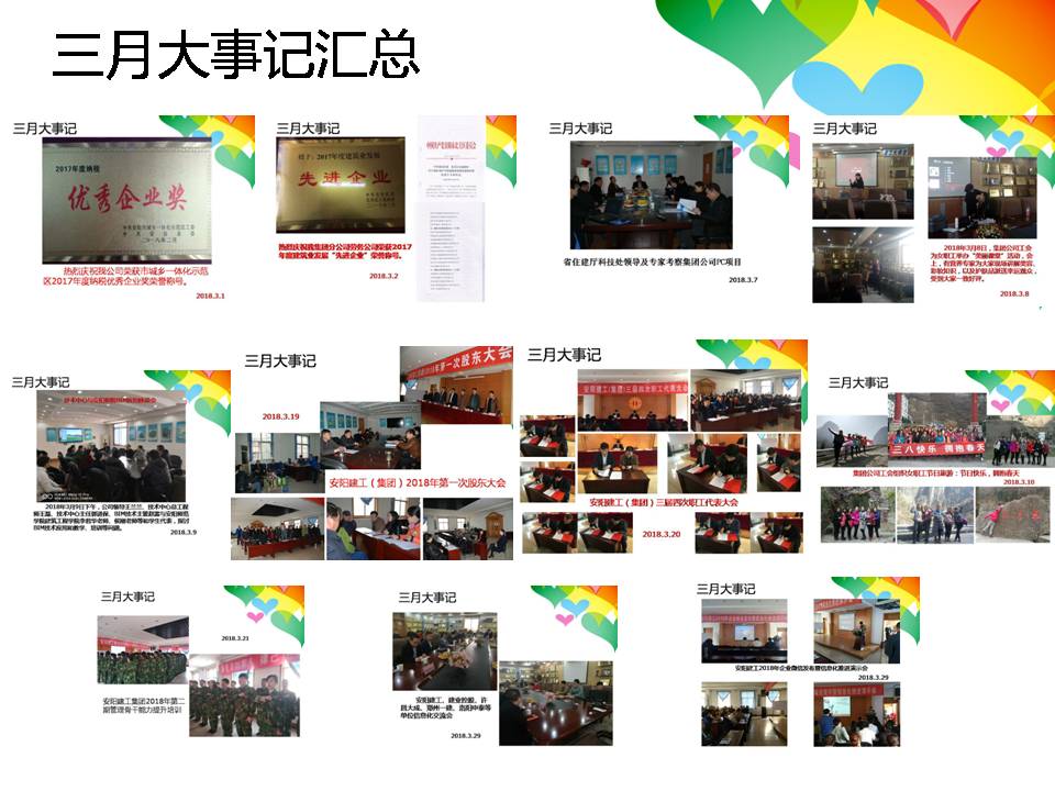三月大事記匯總 集團要聞: 3月19日,集團2018年第一次股東大會圓滿落幕,3月20日,集團三屆四次職代會如期舉行;兩會共同回顧總結了2017年集團公司發(fā)展所取得的成績,探討展望了2018年的前進方向。 集團喜訊: 本月,集團公司榮獲市城鄉(xiāng)一體化示范區(qū)2017年度納稅優(yōu)秀企業(yè)獎榮譽稱號;集團分公司勞務公司榮獲北關區(qū)2017年度建筑業(yè)發(fā)展“先進企業(yè)”榮譽稱號。 3月7日,省住建廳科技處領導及專家考察集團公司PC項目;3月15日,集團公司控股公司(河南中易恒建筑科技有限公司)pc裝配式建筑基地土地網(wǎng)上成功拍賣,3月22日,安陽市龍安區(qū)2018年第一季度重大項目集中開工活動暨光電(照明)標準化廠房項目開工儀式如期舉行;3月39日,企業(yè)微信發(fā)布暨信息化推進演示會圓滿落幕,為公司的發(fā)展奠定了良好基礎! 員工關懷: 3月8日,集團公司工會組織“美麗課堂”及女職工紅豆峽一日游,在緊張工作暇余,豐富員工的生活。 交流學習: 3月9日,技術中心與安陽師范學院BIM應用座談會圓滿舉行,會議探討了BIM技術應用和教學、培訓等問題。3月21日,集團2018年第二期管理骨干能力提升培訓如期舉行,對員工進行拓展訓練。3月29日,安陽建工、建業(yè)控股、許昌大成、鄭州一建、洛陽申泰等單位信息化交流會圓滿落幕。