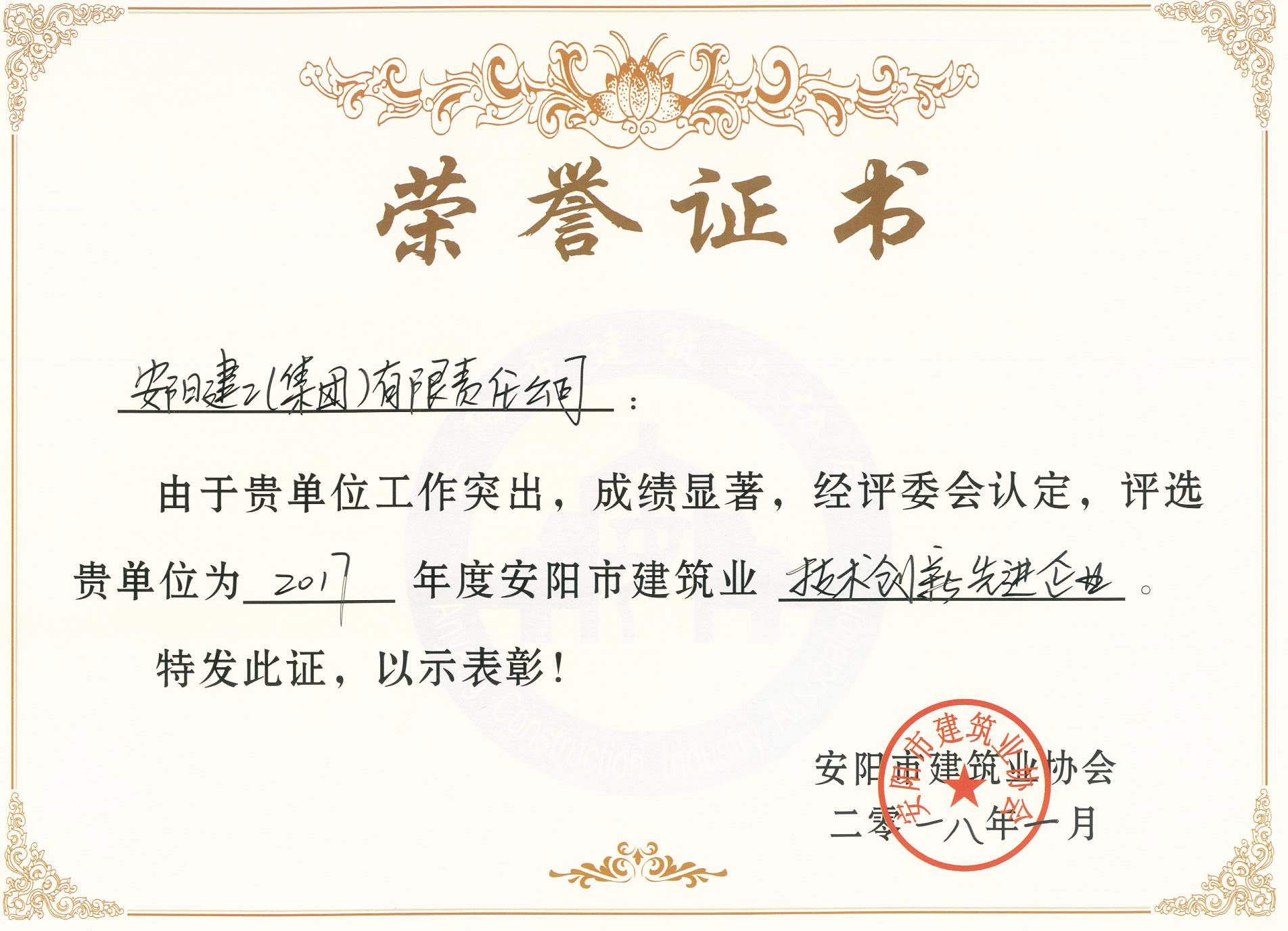 我公司榮獲2017年度安陽市建筑業技術創新先進企業