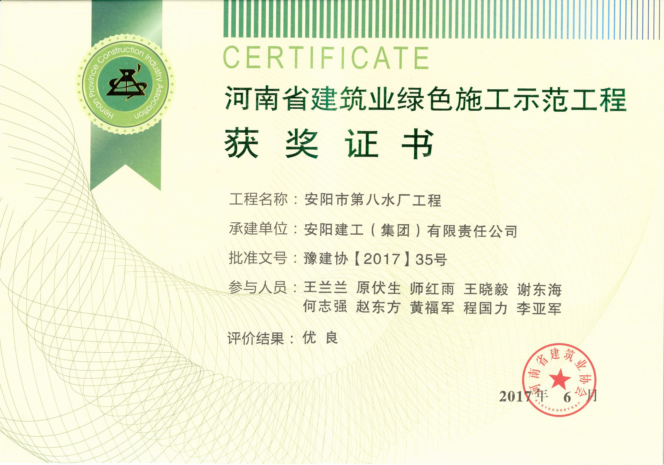 我公司安陽市第八水廠項目榮獲17年省建筑業綠色施工示范工程