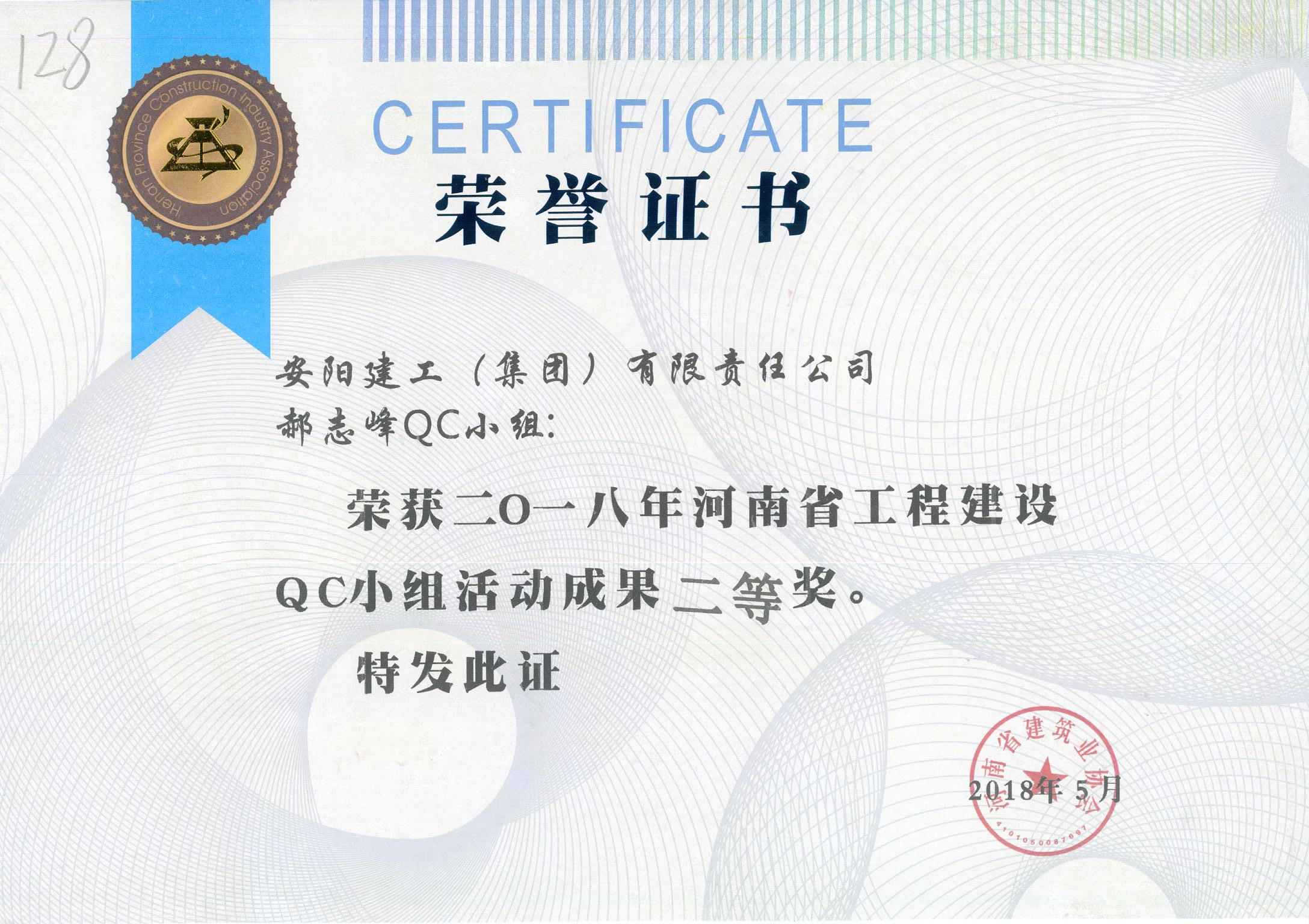 我公司郝志峰QC小組榮獲2018年河南省工程建設QC小組活動成果二等獎