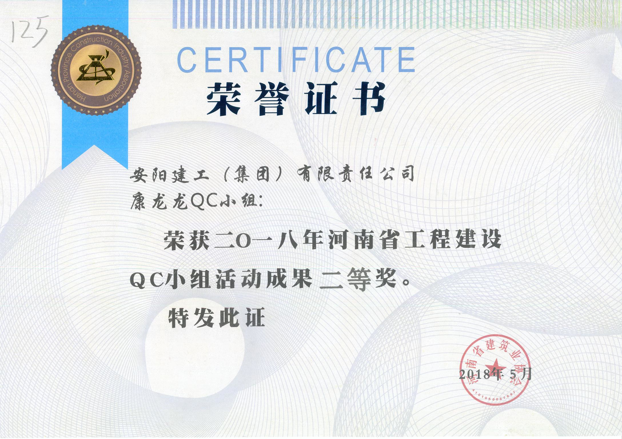 我公司康龍龍QC小組榮獲2018年河南省工程建設QC小組活動成果二等獎
