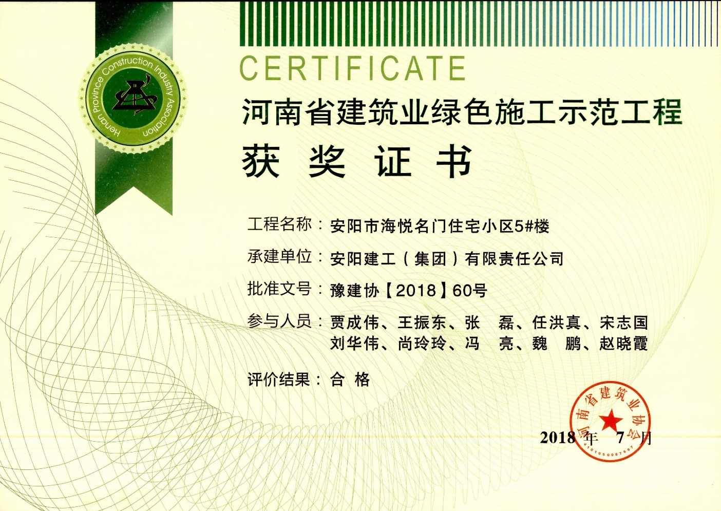 我公司安陽市海悅名門小區4#5#樓項目榮獲18年省建筑業綠色施工示范工程