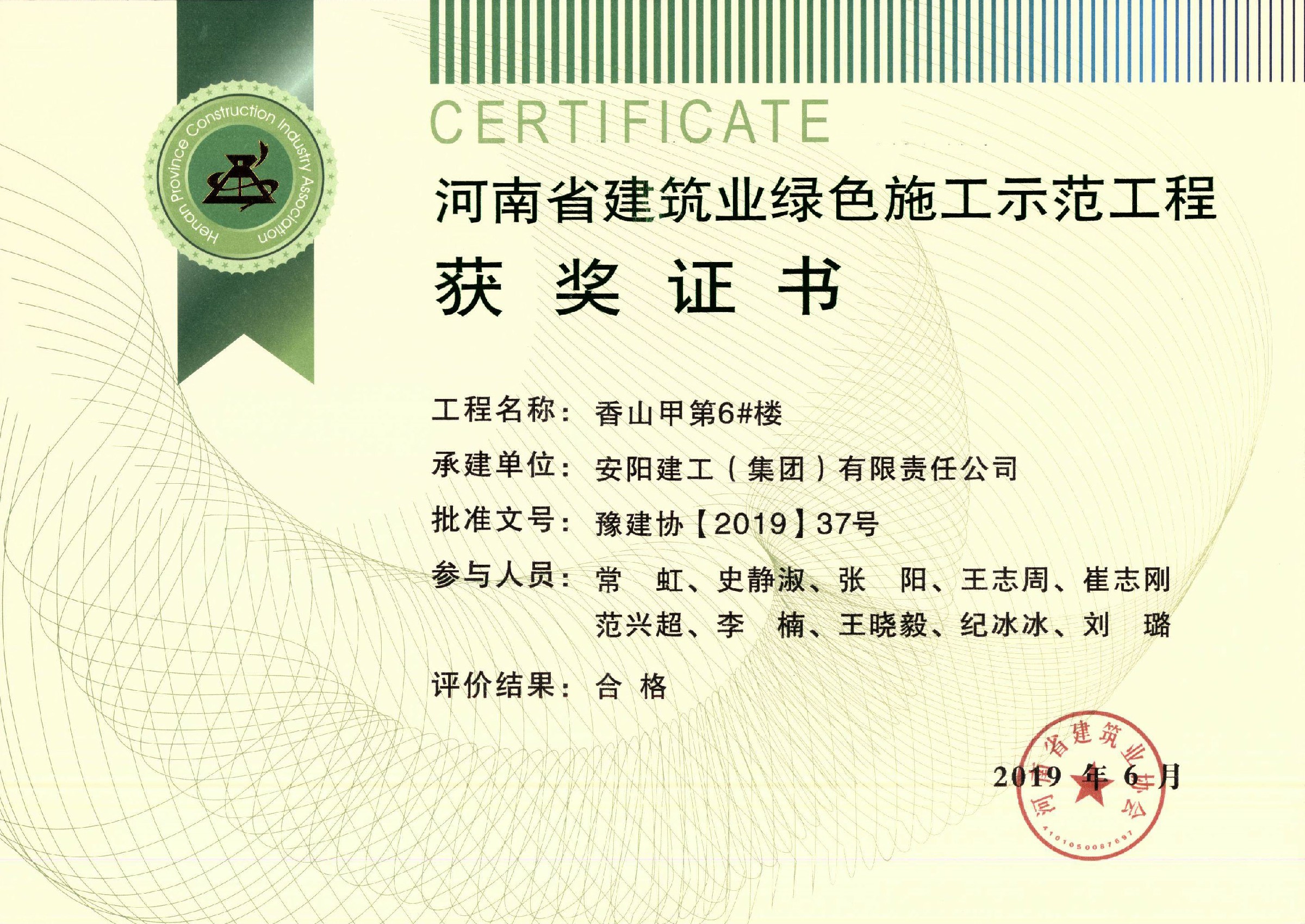 我公司安陽市香山甲第6#樓項目榮獲19年省建筑業綠色施工示范工程