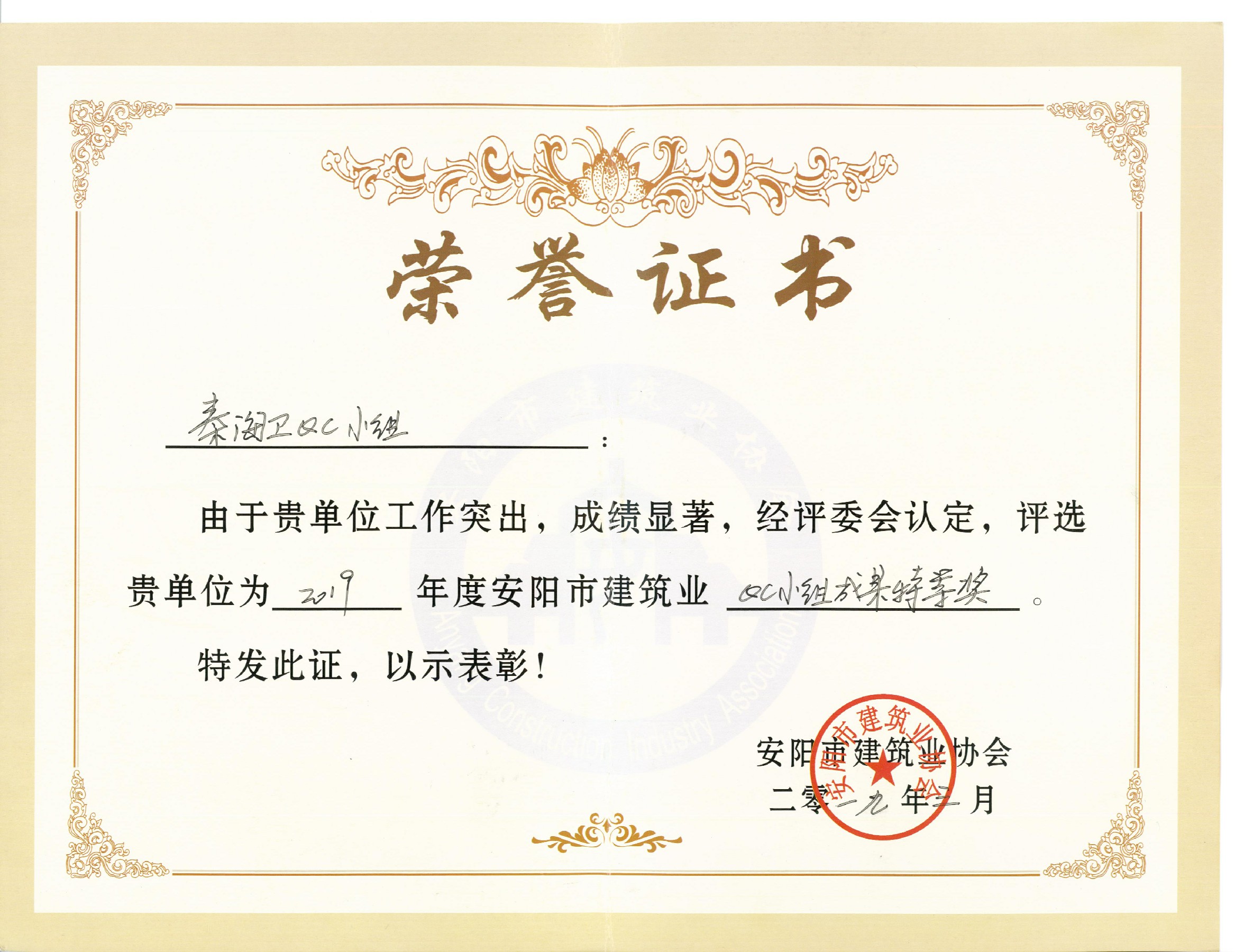 我公司秦海衛QC小組榮獲2019年安陽市建筑業QC小組成果特等獎