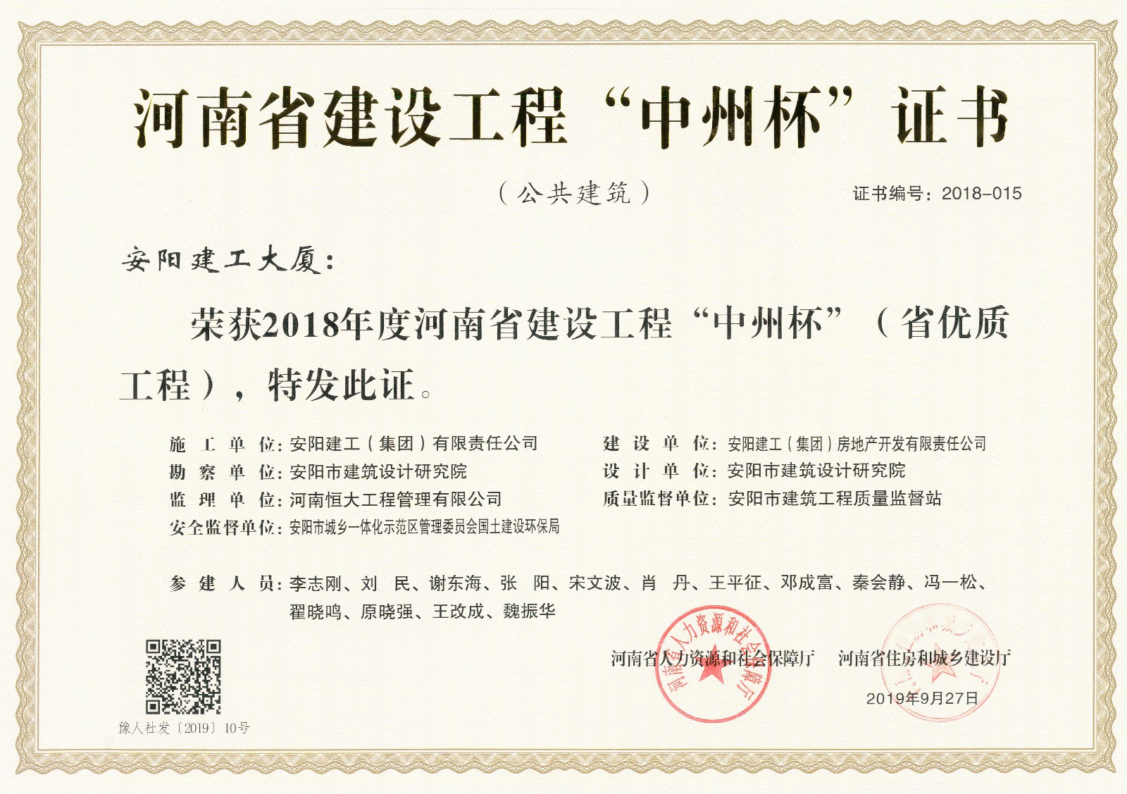 我公司承建的安陽市建工大廈項目榮獲2018年度河南省建設工程中州杯獎