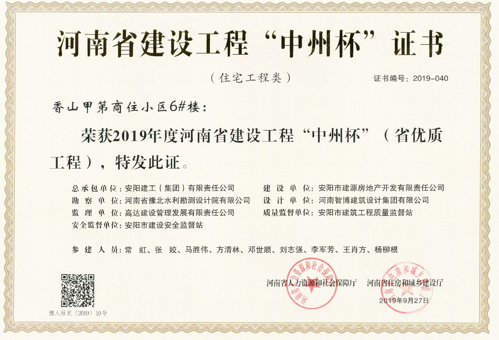 我公司承建的安陽市香山甲第6#樓項目榮獲2019年度河南省建設工程中州杯獎