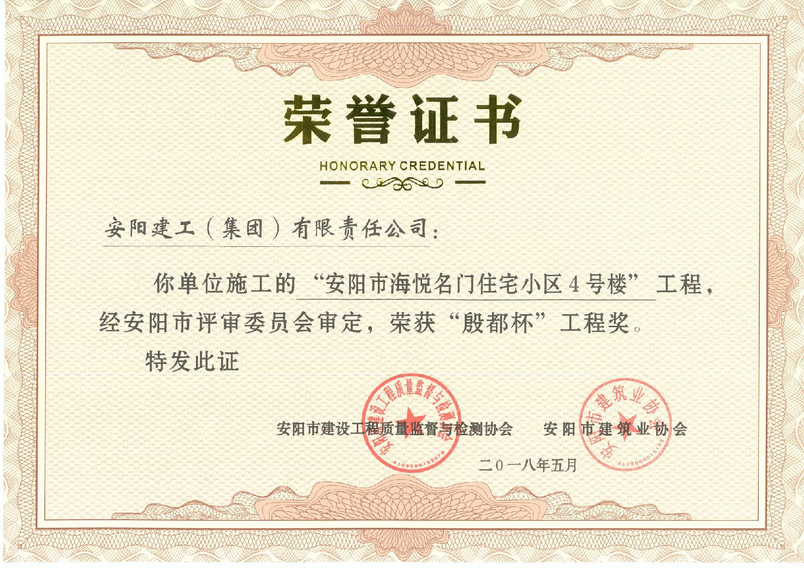 我公司承建的安陽市海悅名門4#5#樓項目榮獲2018年度安陽市殷都杯工程獎