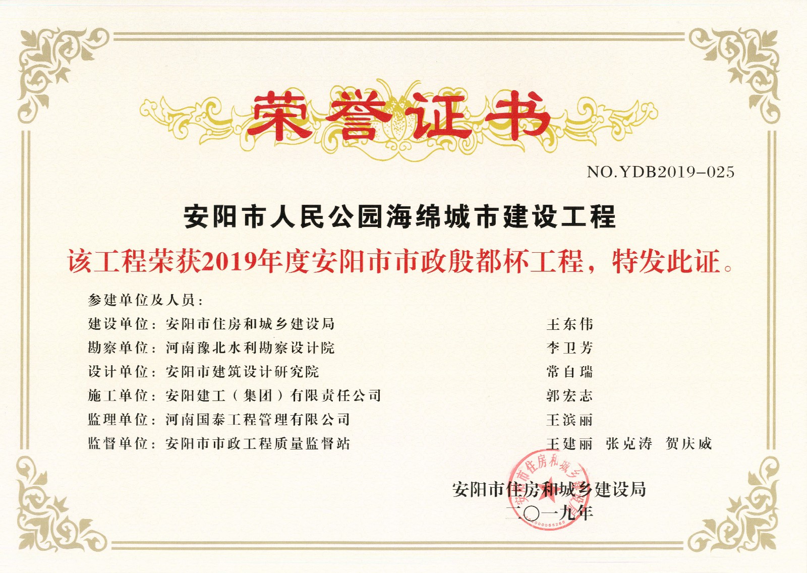 我公司承建的安陽市人民公園海綿城市建設工程榮獲2019年度安陽市市政殷都杯工程獎