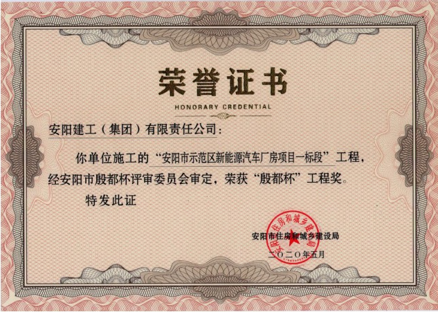 我公司承建的安陽新能源汽車廠房項(xiàng)目一標(biāo)段榮獲2020年度安陽市殷都杯工程獎(jiǎng)