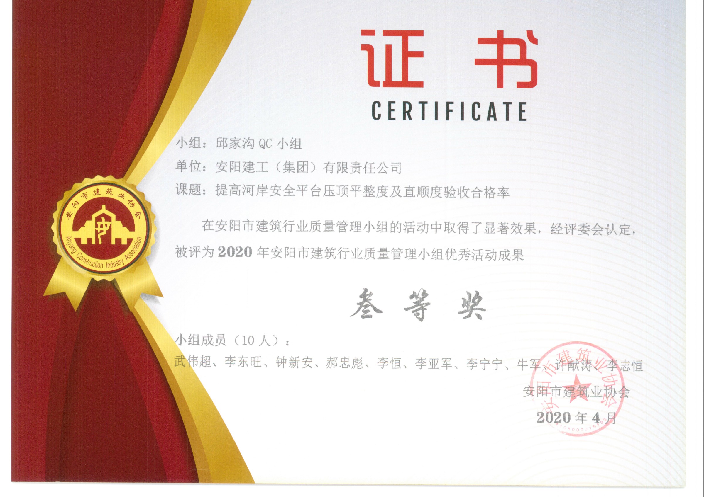 我公司邱家溝QC小組榮獲2020年安陽市建筑行業(yè)QC小組成果三等獎