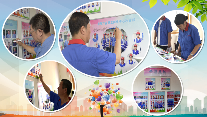 今年會場兩邊的幸福展板是一道靚麗的風景線,展板上展示的是各項目部大家庭的照片,照片上一張張可愛的笑臉,讓人看了如沐春風,傳遞著建工人積極進取的精神面貌,每位領導都在照片上簽上了安全祝福語。