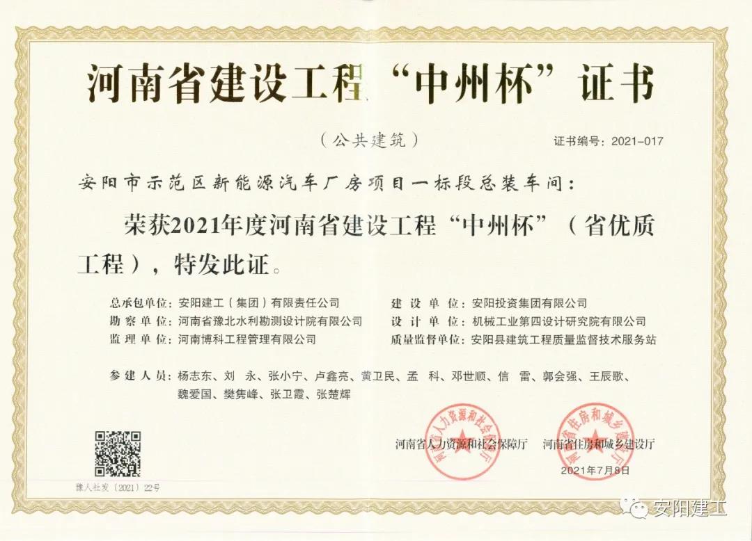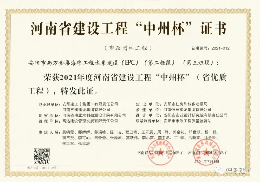 近日,喜報連連,我公司承建的“安陽市示范區新能源汽車廠房項目一標段總裝車間”、“安陽市南萬金渠海綿工程水系建設(EPC)(第二標段)”等多項工程榮獲“2021年度河南省建設工程‘中州杯’(省優質工程)”獎,獲獎工程涵蓋了住宅工程、公共建筑、市政園林等多個領域。