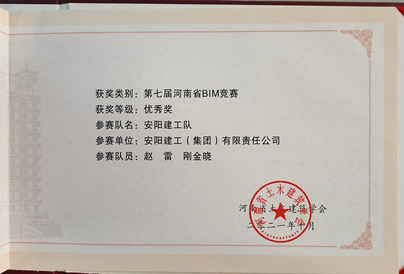 創新驅動發展,科技引領未來 ——公司BIM技術再創佳績! 2021年9月24日-9月28日,我公司BIM中心趙雷主任及剛金曉代表集團公司參加河南省土木建筑學會舉辦的第七屆河南省建筑模型大賽,來自省內多所高校、設計企業、施工企業及聯合體80多個團隊參賽,覆蓋面廣,業界關注度高。公司BIM代表隊最終榮獲優秀獎。 此次大賽為行業內BIM技術人員及高校學生提供了一個交流與競技的平臺。我們將再接再厲,結合公司實際,抓重點,突出亮點,使BIM技術更好的服務管理,創造價值,為集團公司高質量發展賦能增效!