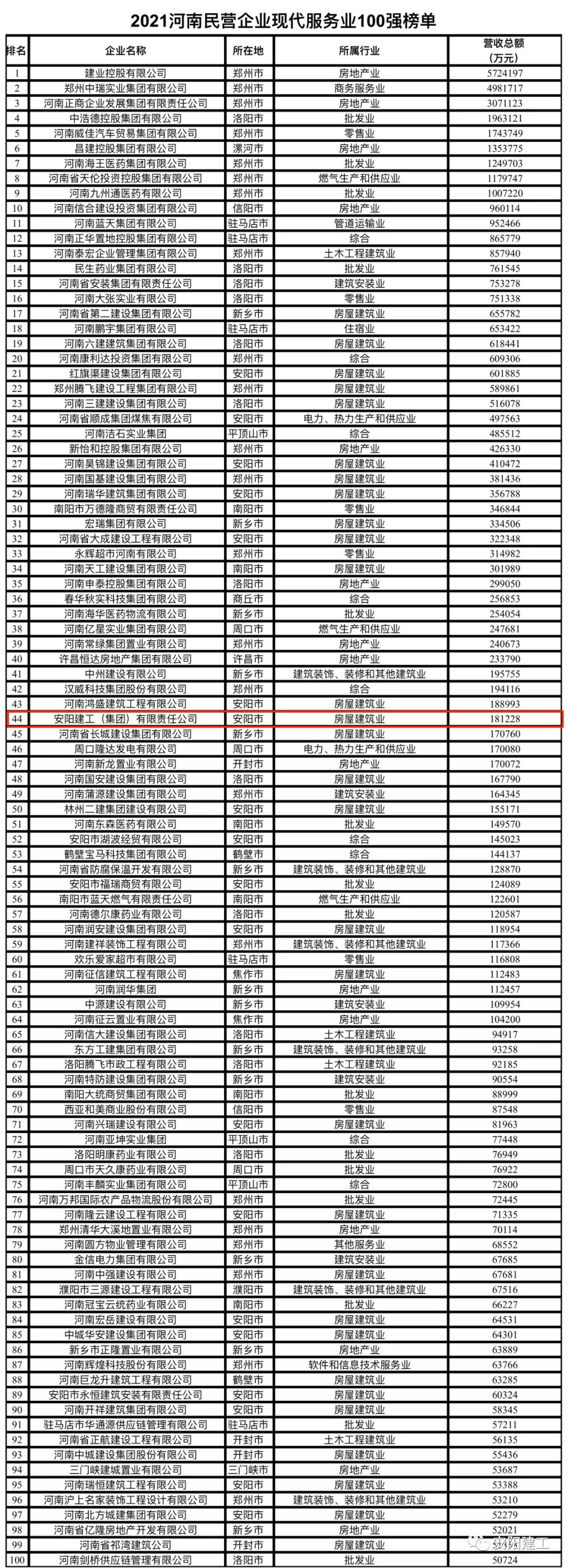 12月8日,省政府新聞辦舉行2021河南民營(yíng)企業(yè)100強(qiáng)新聞發(fā)布會(huì),公布2021河南民營(yíng)企業(yè)100強(qiáng)榜單。以企業(yè)2020年度營(yíng)業(yè)收入總額為基本標(biāo)準(zhǔn),現(xiàn)產(chǎn)生出“2021河南民營(yíng)企業(yè)100強(qiáng)榜單”,以行業(yè)類別和企業(yè)2020年度營(yíng)業(yè)收入總額為基本標(biāo)準(zhǔn),產(chǎn)生出“2021河南民營(yíng)企業(yè)制造業(yè)100強(qiáng)榜單”、“2021河南民營(yíng)企業(yè)現(xiàn)代服務(wù)業(yè)100強(qiáng)榜單”。我公司再次喜獲2021年河南省民營(yíng)企業(yè)現(xiàn)代服務(wù)業(yè)100強(qiáng)榮譽(yù)!