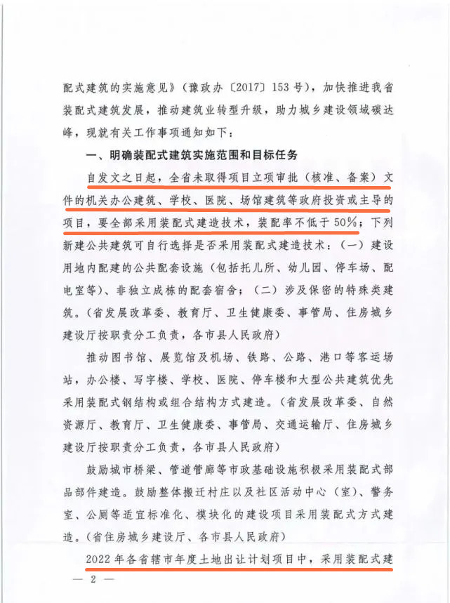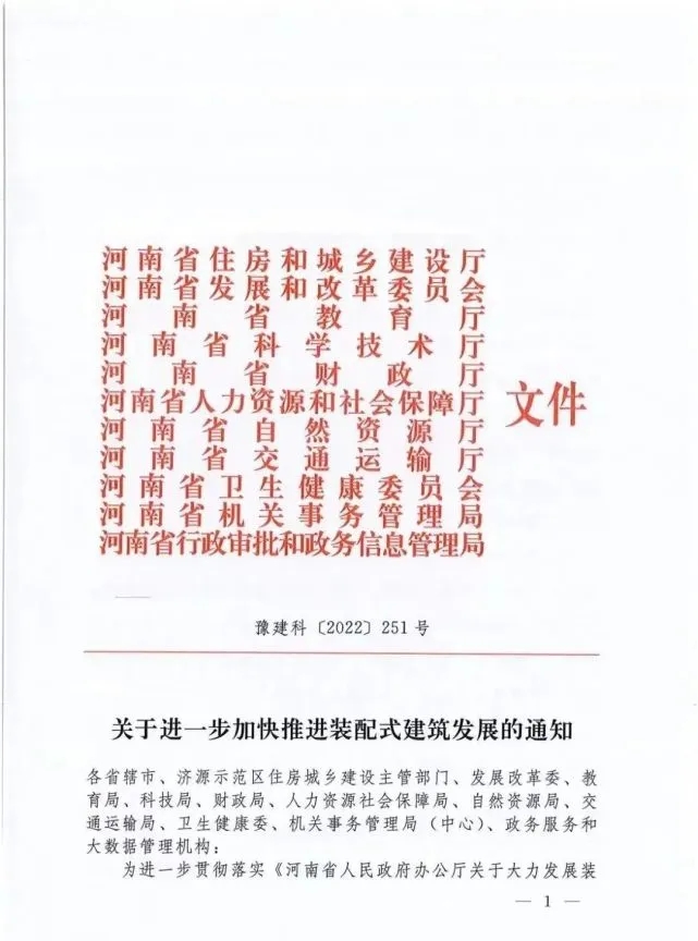 近日,河南省住建廳、省發改委等11個部門聯合印發了《關于進一步加快推進裝配式建筑發展的通知》。通知要求,自發文之日起,全省未取得項目立項審批(核準、備案)文件的機關辦公建筑、學校、醫院、場館建筑等政府投資或主導的項目,要全部采用裝配式建造技術,裝配率不低于50%。