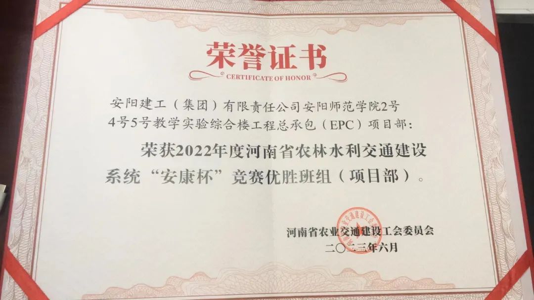近日,河南省農業水利交通建設工會豫農業交通建設工【2023】19號文件 ,對2022年度全省農業水利交通建設系統“安康杯”競賽活動優勝單位、優勝班組、優秀個人和優秀組織單位進行通報表揚。安陽建工(集團)有限責任公司安陽師范學院2號4號5號教學實驗綜合樓工程總承包(EPC)項目部榜上有名,被授予“優勝班組(項目部)”稱號。